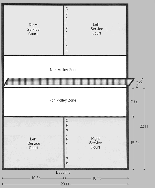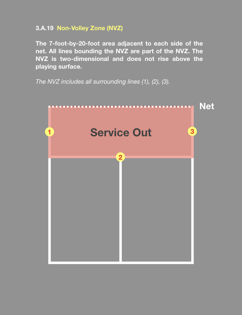 There’s a zone called “the kitchen” within 7 feet on both sides of the net. This is the “non-volley” zone — meaning you can only hit a ball from this zone on a bounce. If you hit a volley (in the air, no bounce) when standing in the kitchen, it’s considered a fault. It’s also a fault if you accidentally step into the kitchen after hitting a volley, even if it’s just momentum that sends you there. Standing on the kitchen line counts as being in the kitchen.